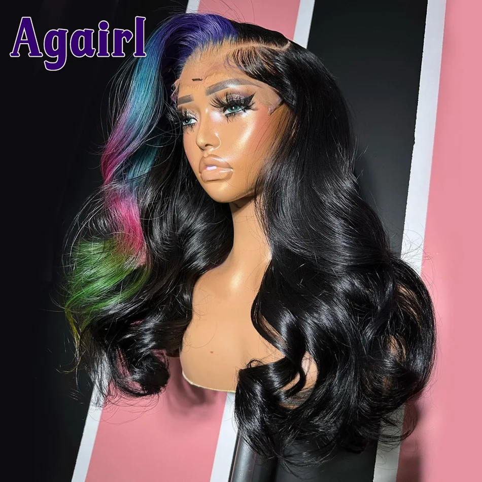 Highlight Blue Pink Green Body Wave Lace Frontal Wig Transparent Lace Front Human Hair Wigs 30 32 Inch 5x5 Lace Wig Pre Plucked
